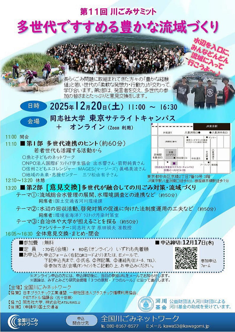 | この11年の間に海洋プラスチックごみ問題は、世界的に喫緊な環境問題として多くの人に知られるようになり、官民で各種の対策取組が進められるようになりました。また第六次環境基本計画により国民一人ひとりのウェルビーイングが問われ、国土交通省でも流域総合水管理において流域のあらゆる関係者の協働が求められています。一方、市民団体の高齢化問題が散見されています。 そこで、多世代が協働し、あらゆる関係者が自分事として川ごみ対策にも取り組み、流域全体でのごみのない豊かな川づくりの推進について様々な立場の方々と一緒に考えてまいります。皆さまのご参加をお待ちします。 |