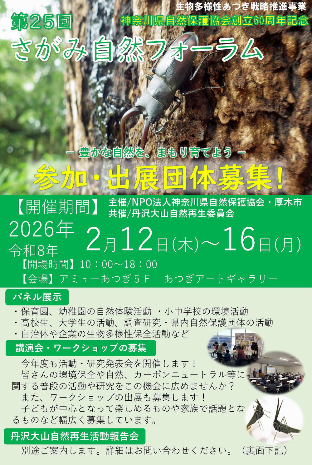 ・2025.12.24 カワラノギク保全活動更新しました 【外部との交流】天竜川流域(中川村)ツツザキヤマジノギク保全交流報告が見れます ・2025.12.19 行事予定表更新しました 2/5(木)10:00~あじぇんだ113(56号)第2回編集会議 ※Zoomオンライン開催 ・2025.12.19 行事予定表更新しました 2/2(月)13:10~16:00 第6回市民部会 場所:サン・エールさがみはら+Zoomオンライン開催 ・2025.12.18 行事予定表更新しました 2026年1/19(月)13:30~ 第6回幹事会 ※Zoomオンラインで開催 ・2025.12.01 行事予定表更新しました ①12/18(木)10:00~あじぇんだ113(56号)編集会議 ②12/18(木)13:30~第5回幹事会 ※①、②共にZoomオンライン開催 ・2025.11.23外部団体のイベント参加 第19回ひらつか市民活動センターまつり 日時:11月23日10:00~15:00 パネル展示及び活動紹介 ・2025.11.17外部団体のイベント紹介 第25回さがみ自然フォーラム 日時:2026年2月12日(木)~16日(月)※出典参加準備中 ・2025.11.15外部団体のイベント参加 茅ヶ崎市の特別緑地保全地区 清水谷の自然環境を保全する活動・竹林伐採作業 ・2025.11.14全国川ごみネットワークイベント紹介 第11回川ごみサミット参加者募集中 ・日時:12/20(土)11:00~16:30 ・会場:同志社大学 東京サテライトキャンパス+オンライン ・参加申申込:12/17(水)締切 ・2025.11.11 行事予定表更新しました 12/8(月)10:00~第5回市民部会開催 ※今回はZoomオンラインで開催 ・2025.11.10かながわプラごみゼロ宣言チラシ掲載しました 右欄の「相模川クリーンキャンペーン」の二次元コードからLINE友達になれます ・2025.11.06会報誌 アジェンダ113(55号)発行掲載しました 創刊号からの会報誌が「会報誌 アジェンダ113」ページで閲覧できます ・2025.11.05会員からのイベント紹介掲載しました やまなし森づくりフォーラム 2025 11/14(金)13:00~会場及びオンライン同時配信 ・2025.11.04カワラノギク保全地調査実施しました 明治大学農学部 倉本教授と相模川の保全地を巡り生息状況を確認 ・2025.10.30カワラノギク保全活動更新しました 相模川神沢河原・神川橋下流河川敷保全地でカワラノギク開花が始まりました ・2025.10.24外部団体との交流掲載しました 茅ヶ崎市の特別緑地保全地区 清水谷の自然環境を保全する活動に参加しよう! ・2025.10.22外部団体のイベント紹介掲載しました ~身近なことに目を向けて 動き出そう~ 私たちの水を守る 主催:さがみ生活クラブ生協南さがみはらコモンズ ・2025.10.18中川村ツツザキヤマジノギク保全協議会交流しました 「伊那谷の豊かな自然を未来につなぐ」地域の報告と講演会 *AM:保全地観察会 PM:交流会 ・2025.10.18第6回 岡谷こどもエコクラブ協力しました 外部団体との交流「桂川・相模川流域ごみ調査」イベントのお知らせで確認できます ・2025.10.12流域シンポジウム報告掲載しました 「流域シンポジウム」ページで内容が確認できます ・2025.10.06石倉カゴによるウナギ調査掲載しました 第4回(9/10)、第5回(10/5)調査報告、調査時の写真更新 ・2025.10.04カワラノキク関連の情報紹介しました 明治大学農学部倉本教授講演(10/4)参加報告 ※更新履歴一覧(2025年9月以前)は