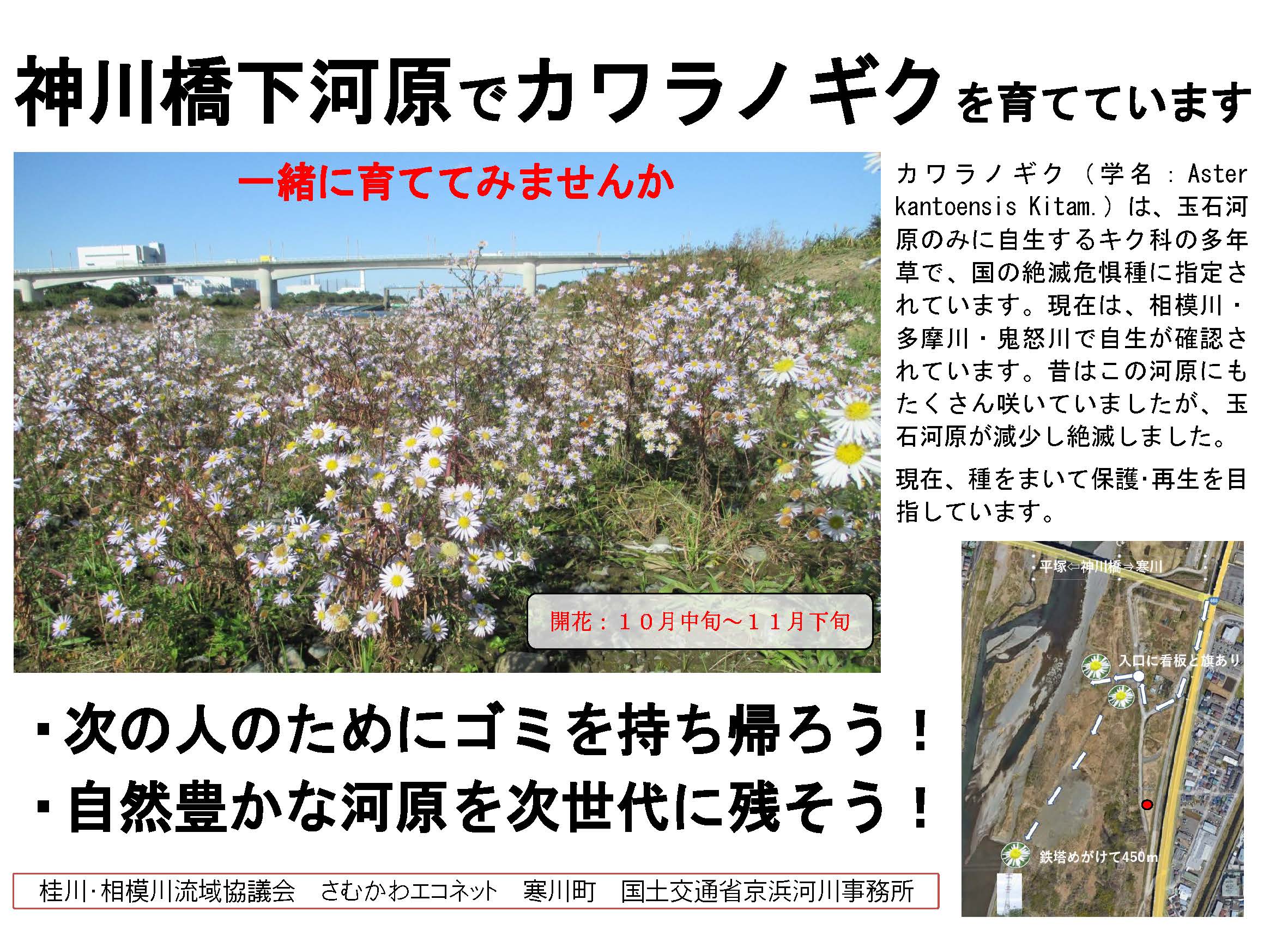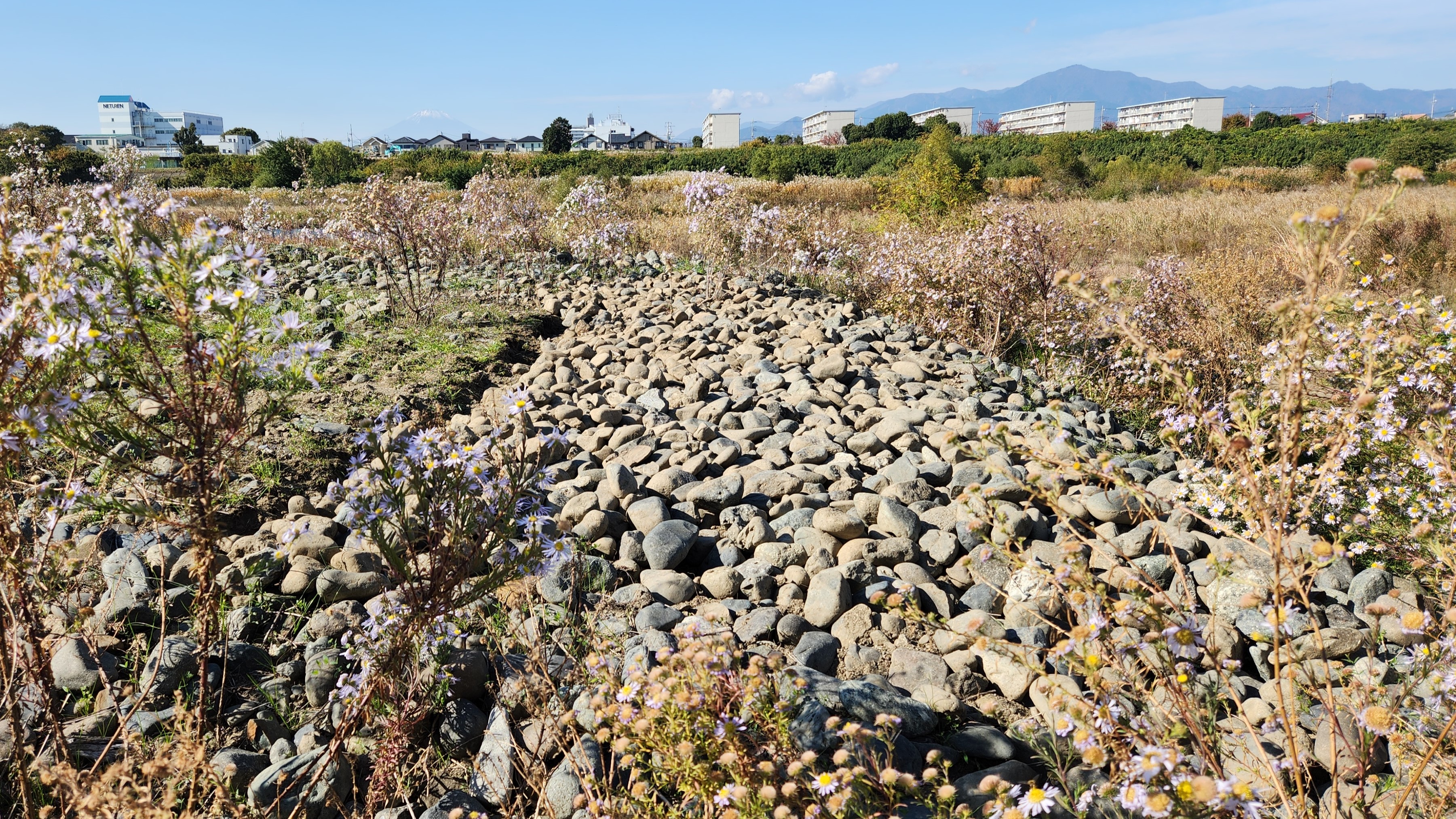 ※2025年度は新たに支流(目久尻川)での調査を行ないます 新たに設置した相模川支流目久尻川での調査内容 場所:目久尻川(寒川広域リサイクルセンター横) ![]() ![]() 神奈川県内水面試験場、さむかわエコネットの協力がありました ![]() ![]() ![]() ※相模川右岸(馬入水辺の楽校地先)での調査内容 ![]() 湘南生き物楽校のイベントと共同で調査を行います ![]() ![]() ※2023・2024年度調査結果は「イベント紹介」ページで確認できます 相模川上流神沢河原・六倉河原カワラノギク保全 河原の入口に”カワラノギクを守ろう”看板設置 ![]() 2025年4月6日(日)9:30~神沢河原で種まき実施 ![]() ![]() 若芽を野ウサギに食べられ、脇芽(わきめ)が成長して開花(11月4日撮影) *脇芽は、植物が成長する過程で新しい枝や花を形成するために生じる芽のひとつ ![]() 相模川右岸 愛川町六倉の河原でも約100株が開花 ロゼットもみられる *河原一面にコセンダングサが繁茂している ![]() 相模川下流神川橋河原 カワラノギク保全 ![]() 2024年10月下旬~11月上旬の開花情報を動画で紹介します 絶滅回避する方法として試行中の「生息域外保全」を紹介 Mさん(寒川町):玉石河原を模して育てたカワラノギク *今年(2025)は、こぼれ種で庭の花壇一面に繁茂して開花 ![]() 2025年11月14日 神川橋下流河川敷でカワラノギクが満開を迎えました ![]() ![]() 高台圃場では増水によるシルトの堆積で埋もれた玉石の浮き石作業を開始 ![]() カワラノギクの種が飛散する前に玉石を浮かして着地環境を良くする ![]() 玉石の浮かしは手作業で一つひとつ根気よく行ないます ![]() 「はまり石」をカワラノギクが発芽・定着するミクロな環境「浮き石」状態にします ![]() 出展:環境省(平成29年3月)水生生物による水質評価表マニュアル-日本版平均スコア法-より 満開のカワラノギクをYouTubeで見学してください 一緒にカワラノギク保全される方をお待ちしています ![]() 湘南野鳥図鑑・湘南水辺の探鳥マップ ※画像をクリックするとpdfファイルが開きます ![]() ![]() 桂川・相模川流域協議会紹介ポストカード ※画像をクリックするとファイルが開きます 桂川・相模川流域協議会のイベントなどでお配りします 【天然アユの産卵バージョン】 【カワラノギク保全バージョン】 ![]() 【梅花藻生息状況】 ![]() 【桂川・相模川流域協議会紹介】 ![]() |