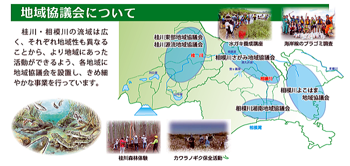 地域環境の保全を効果的に行うため、市町村や支川単位、又はいくつかの市町村にまたがって設置します。 地域協議会の運営については、各地域協議会が定めることとなっており、 地域の実情にあわせた独自性のある運営が可能です。