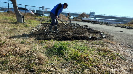 2022年2月6日 相模川神川橋下河原でカワラノギク種まき準備