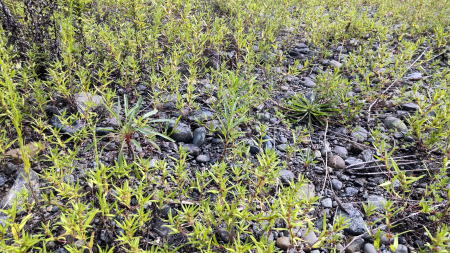 さがみ地域協議会では、4月に六倉河原と神沢河原に種まきを行った。 六倉河原は、出水のたびに濁水が流れ、河原の石が土に覆われてきて、オオキンケイギクやシナダレスズメガヤ等の繁殖が凄く、去年までは草刈りをしてきましたが、今年は追いつかないほどになり、草刈りを断念した。 それでも6月にはカワラノギクがそれなりに見られましたが、10月に下見に行ったときは、オオブタクサは下火になっていましたが、クズ、カナムグラ等の蔓がひどくなっていました。 川の流れに近いところは19年の台風の時の洪水で表土がすっかり流され、玉石が残って、昨年はカワラノギクが沢山育っていましたが、その後出水のたびに土が入り込み今年は一面にセンダングサが茂った。草の間にぽつぽつとカワラノギクのつぼみが見え、2か所ほどかたまって生えている個所があるので道を付けるため草刈りをしてみたが、1日や2日ではどうにもならないほどだった。 ※11/23(木)調査では、川の流れに近いところで、100株以上の開花を確認した。 ロゼットも数か所でまとまって見られた。一面にセンダンクサが繁茂していた。 以前に玉石を敷き詰めた圃場はクズが一面を覆っているので調査に入れなかった。 神沢河原の方は、手前の圃場は六倉以上に富栄養化が進み、開花株は4本くらいしか見られません。ずっと前に圃場だった所は玉石が残っていて、ノバラやセンダングサが茂っています。車が入れる所なので、今年はジムニーなどで来て、テントをはり、ソロキャンプをしている人がよくいます。 ※11/23(木)調査では、車が通りできた通路横の草むらに16株の開花が確認できた。 ロゼットは2株の確認だけだった。こちらも玉石河原をセンダンクサが覆っていた。 |