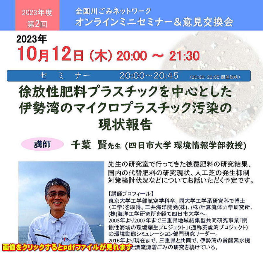 | 【セミナー】 講師 千葉賢先生 ・海洋プラスチック問題における国際的な動き ・海洋に流出するプラスチックの量 ・マイクロプラスチックと生態系の関係 ・マイクロプラスチックの危険性 ・伊勢湾海岸のマイクロプラスチックごみの分布 ・徐放性肥料(樹脂被覆肥料、PCRF)の問題 ・徐放性肥料(被覆肥料)のしくみ ・水田から樹脂被覆の流出のしくみ ・吉崎海岸のマイクロプラスチック調査(千葉研究室) ・全農 プラスチック被膜殻流出防止紹介、などの取り組み紹介 ※その他、貴重な研究報告が紹介された |